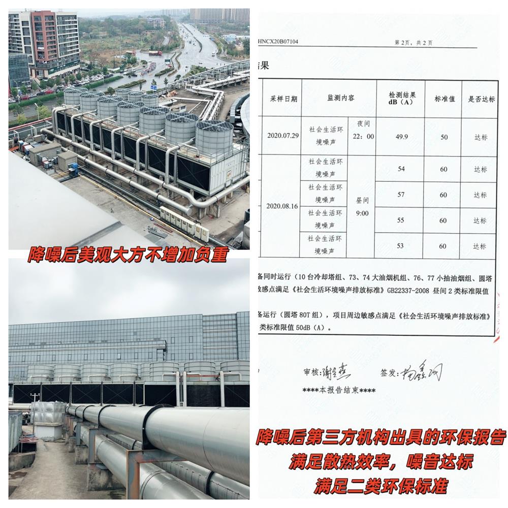 环保性能方面,项目严格遵循二类环保标准要求,降噪后委托第三方权威机构进行全面检测,出具的《环保检测报告》明确显示:冷却塔运行噪音值完全符合二类声环境功能区标准,白天≤60dB (A)、夜间≤50dB (A),有效解决了噪音扰民问题。同时,通过科学的气流疏导设计与散热通道优化,治理过程未对冷却塔散热效率造成任何影响,设备制冷性能保持稳定,真正实现 “降噪与散热并行,环保与实用兼顾”。